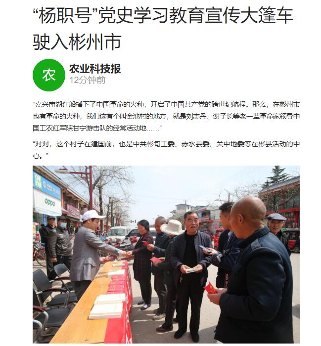 为庆祝中国共产党成立100周年,让党史学习教育深入千家万户,4月14日,杨凌职业技术学院“学习百年党史 筑梦乡村振兴”——“杨职号”党史学习教育宣传大篷车走进彬州市新民镇,受到了当地村民的热烈欢迎。