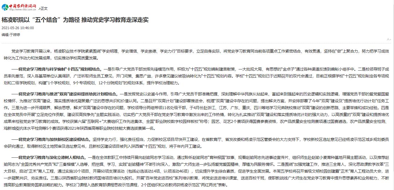 党史学习教育开展以来,杨凌职业技术学院紧紧围绕“学史明理、学史增信、学史崇德、学史力行”目标要求,立足自身实际,将党史学习教育同当前各项重点工作紧密结合、有效贯通,坚持在“做”上聚合力,努力把学习成效转化为工作动力和发展成果,切实推动学校高质量发展。