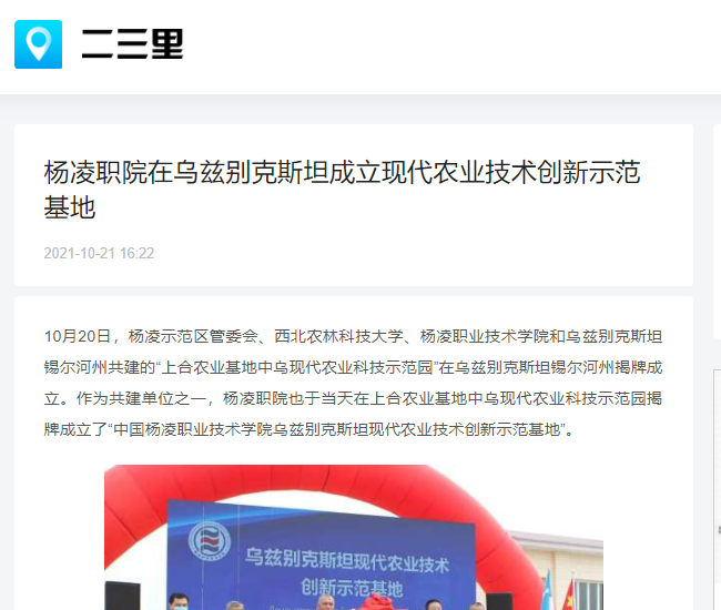 10月20日,杨凌示范区管委会、西北农林科技大学、杨凌职业技术学院和乌兹别克斯坦锡尔河州共建的“上合农业基地中乌现代农业科技示范园”在乌兹别克斯坦锡尔河州揭牌成立。作为共建单位之一,杨凌职院也于当天在上合农业基地中乌现代农业科技示范园揭牌成立了“中国杨凌职业技术学院乌兹别克斯坦现代农业技术创新示范基地”。