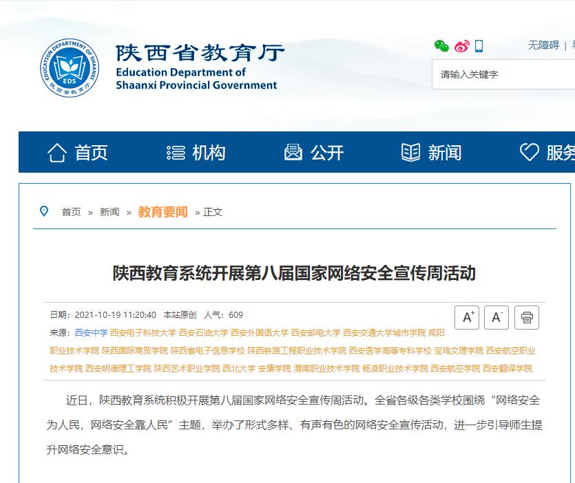 近日,陕西教育系统积极开展第八届国家网络安全宣传周活动。全省各级各类学校围绕“网络安全为人民,网络安全靠人民”主题,举办了形式多样、有声有色的网络安全宣传活动,进一步引导师生提升网络安全意识。