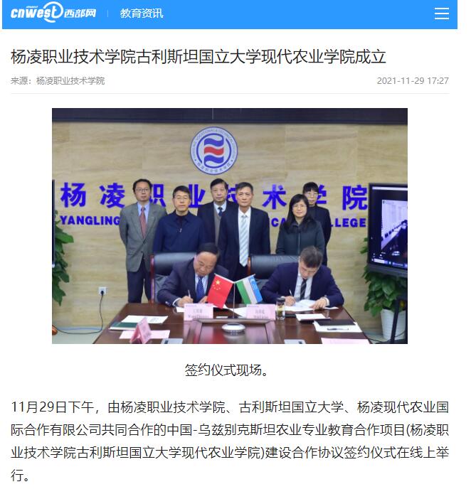 11月29日下午,由杨凌职业技术学院、古利斯坦国立大学、杨凌现代农业国际合作有限公司共同合作的中国-乌兹别克斯坦农业专业教育合作项目(杨凌职业技术学院古利斯坦国立大学现代农业学院)建设合作协议签约仪式在线上举行。