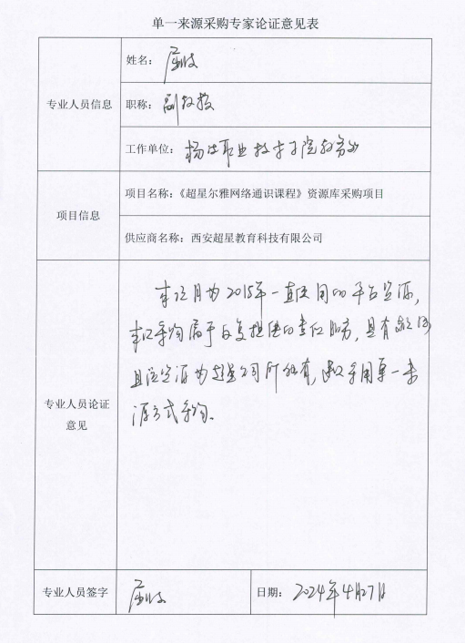 杨凌职业技术学院超星尔雅通识课采购项目,根据项目立项相关资料及专家论证意见,拟采用单一来源采购方式,该项目拟由西安超星教育科技有限公司承担。现将有关情况向潜在的供应商广泛征求意见。