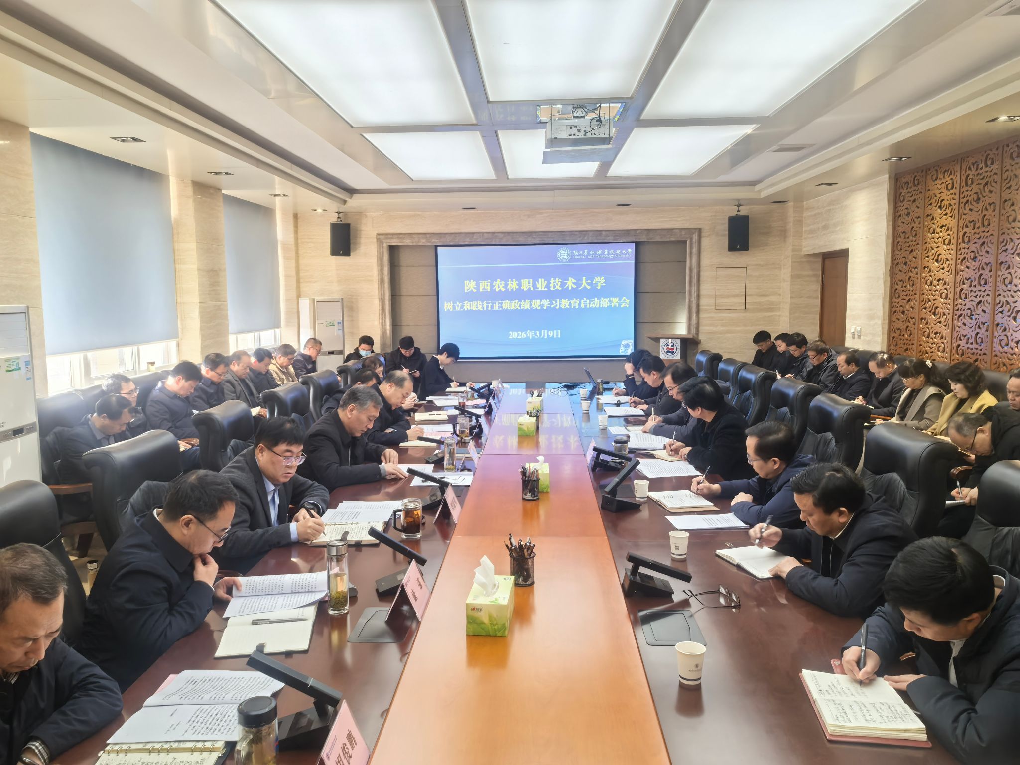 学校树立和践行正确政绩观学习教育,坚持党委统一领导,成立学习教育工作专班。会上深入学习了习近平总书记关于在全党树立和践行正确政绩观学习教育的重要指示精神和中共中央办公厅《关于在全党开展树立和践行正确政绩观学习教育的通知》要求,传达学习了省委常委会会议暨省委党的建设工作领导小组会议精神。