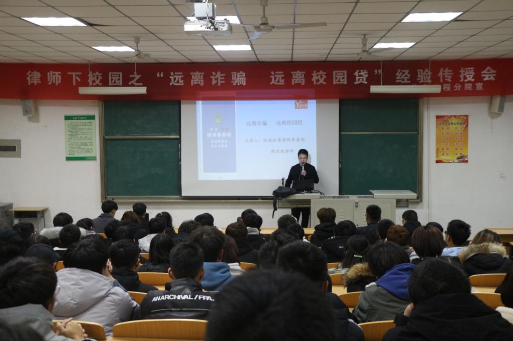 近年来“校园贷”染旧作新,带着不同名目的诱惑走入校园。为提高学生的自我防范意识和能力,切实加强学生安全防范工作。也为了配合学校“纪律安全月”活动。12月18日下午,由陕西松意律师事务所、我校法律顾问薛亚栋律师为信工分院学子在南校NOC201做了“远离诈骗,远离校园贷”报告会。