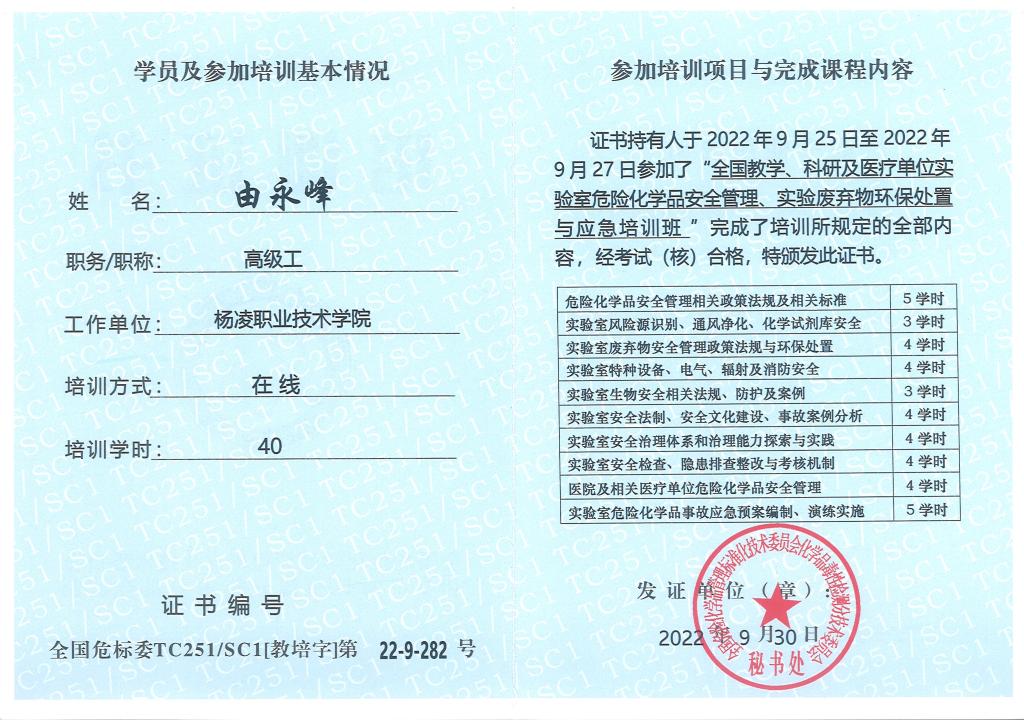 本次培训由全国危险化学品管理标准化技术委员会、化学品毒性检测分技术委员会主办,培训内容包括实验室危险化学品安全管理与实验室建设,实验室“三废”管理与环保处置,实验室特种设备、辐射安全、电气及消防安全,新形势下实验室生物安全建设管理与防护,实验室CMA、CNAS、GLP管理体系介绍,医疗机构危险化学品安全管理,应急管理体系建设与实践,实验室安全、环保、智能化设备及新技术应用8个方面。经在线培训、做学习笔记、安全考试,我院7名实验管理人员均完成了培训规定内容并全部考核合格。