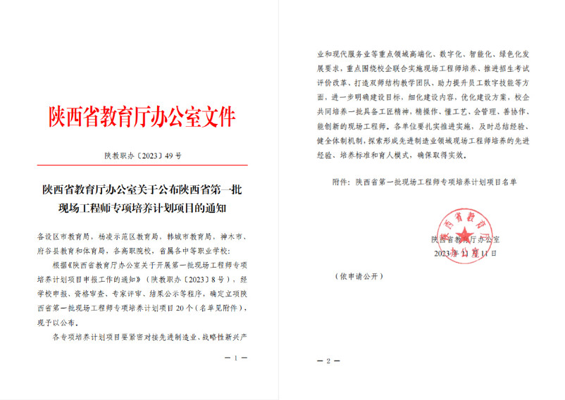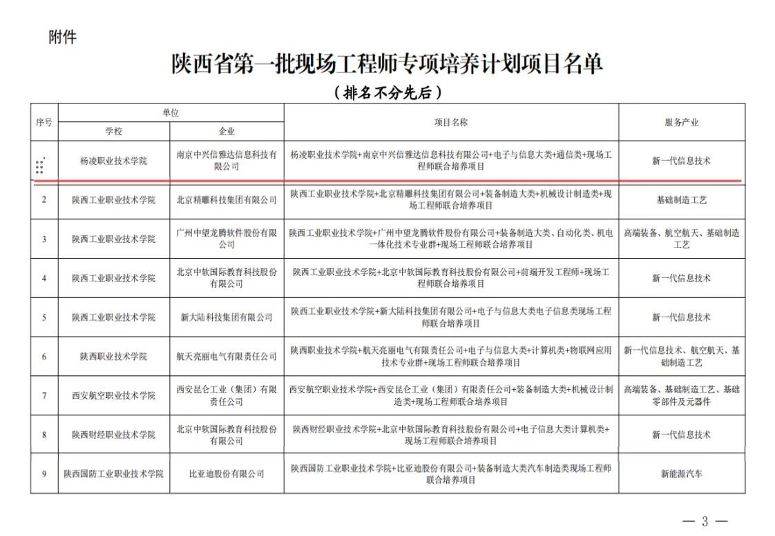 近日,陕西省第一批现场工程师专项培养计划项目立项名单公布,我院《杨凌职业技术学院+南京中兴信雅达信息科技有限公司+电子与信息大类+通信类+现场工程师联合培养项目》成功立项。