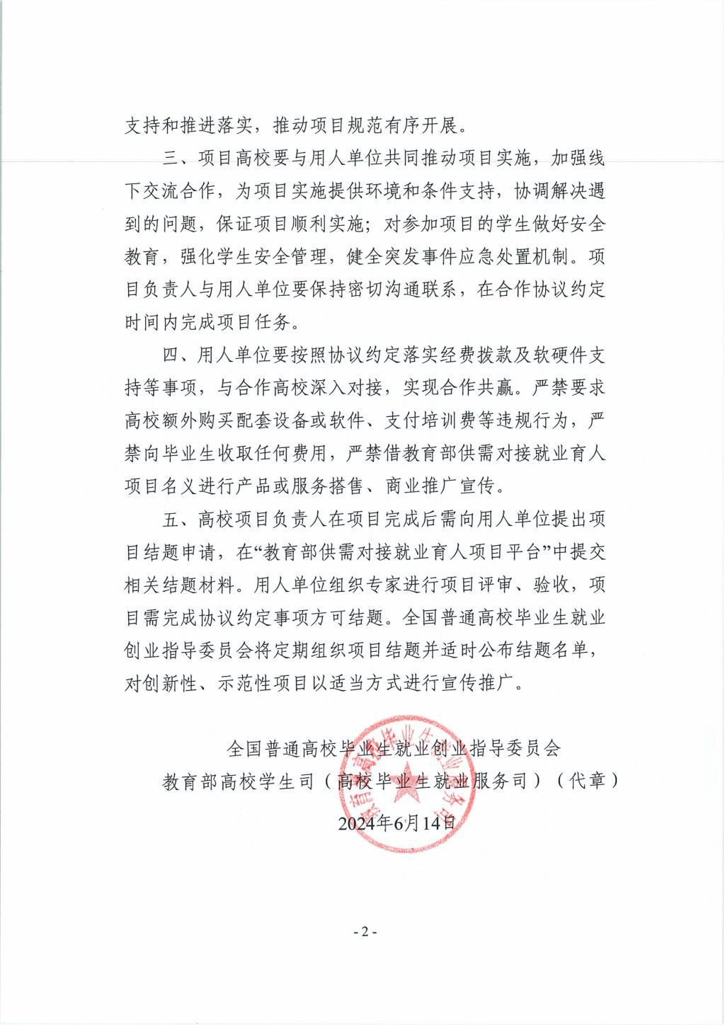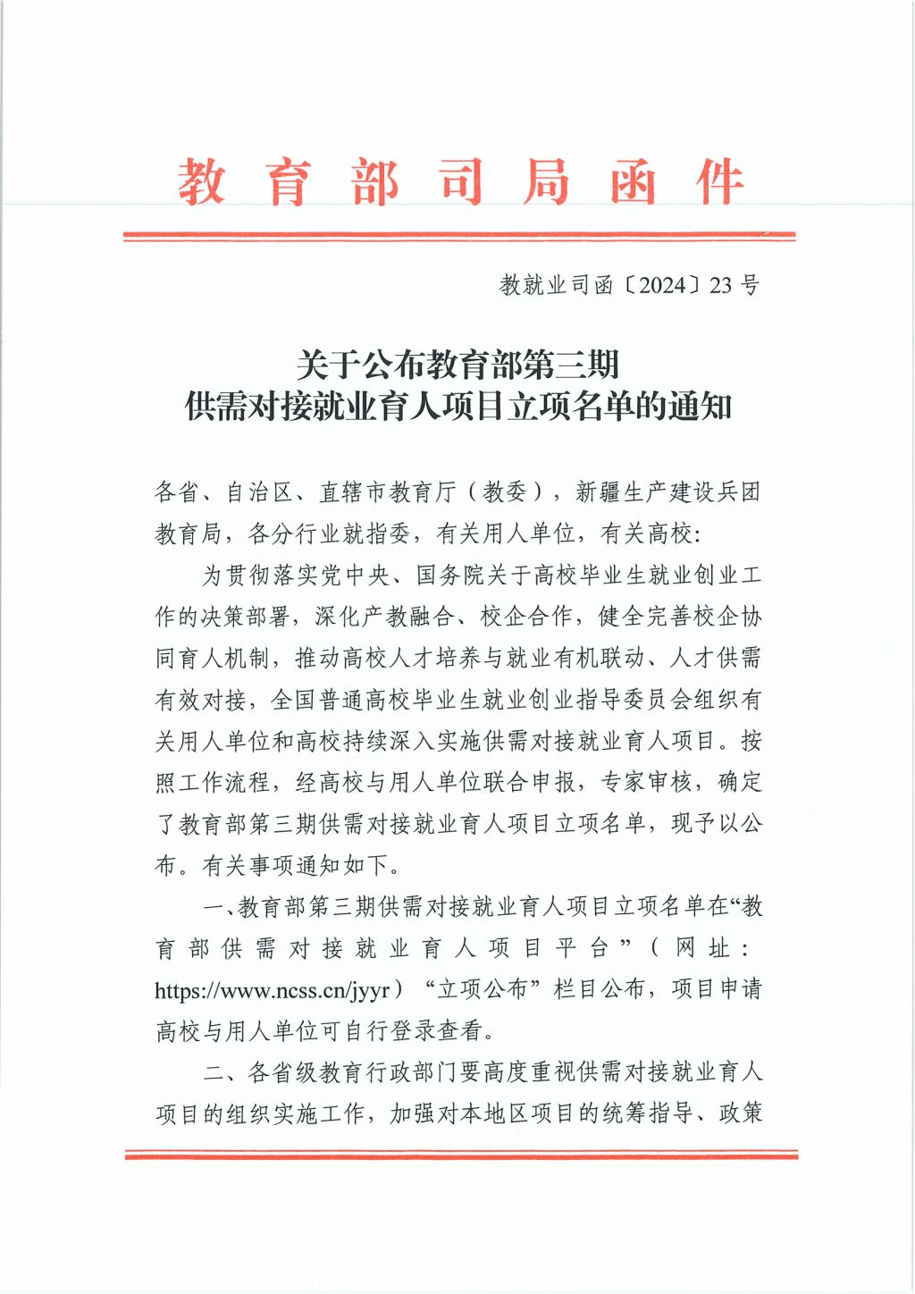 6月14日,教育部高校学生司发布《关于公布第三期供需对接就业育人项目立项名单的通知》(教就业司函〔2024〕23号),信息工程学院与北京新大陆时代科技有限公司联合申报的定向人才培养培训项目以及信息工程学院与西安四叶草信息技术有限公司联合申报的就业实习基地项目分别获得立项。