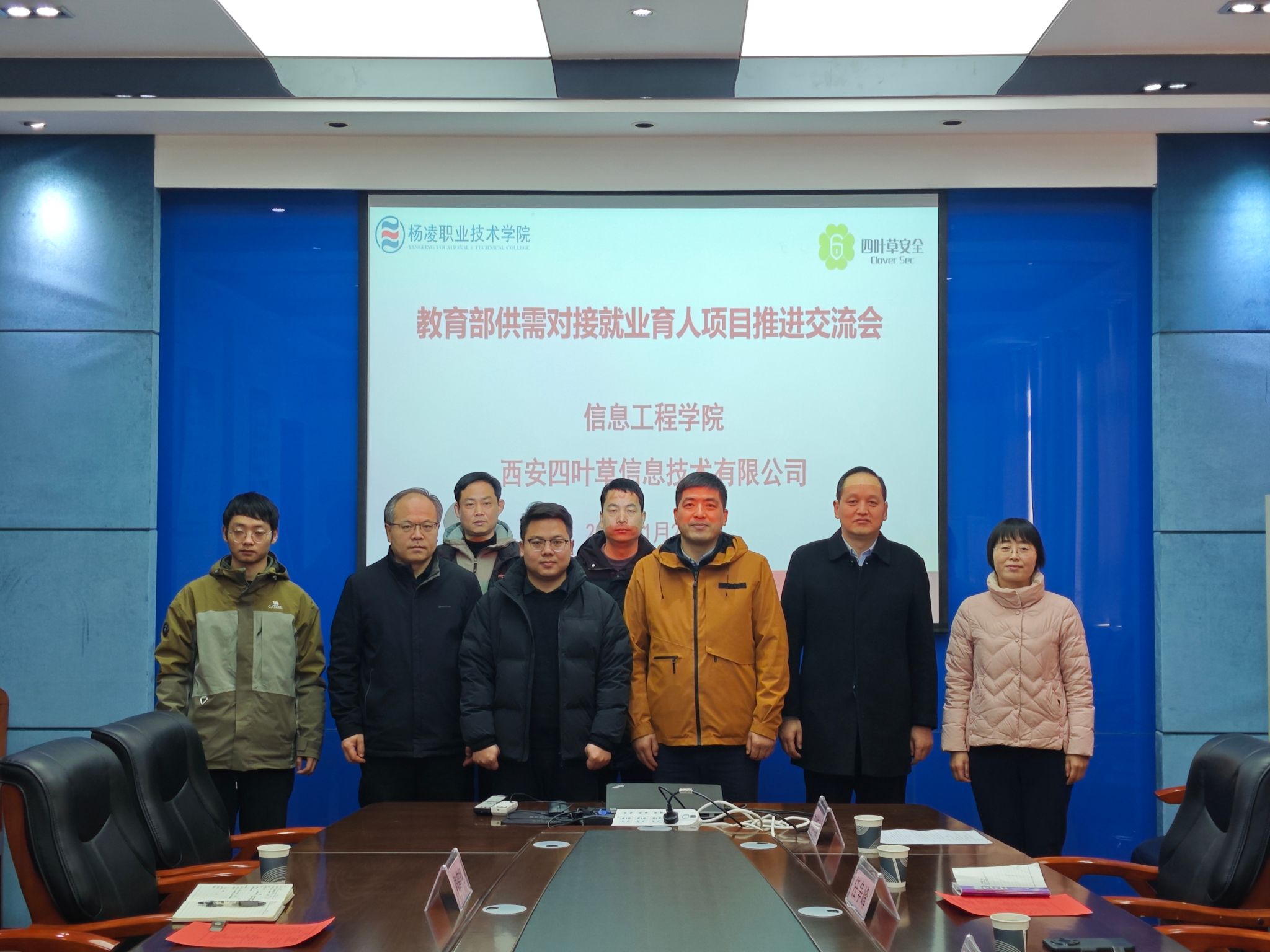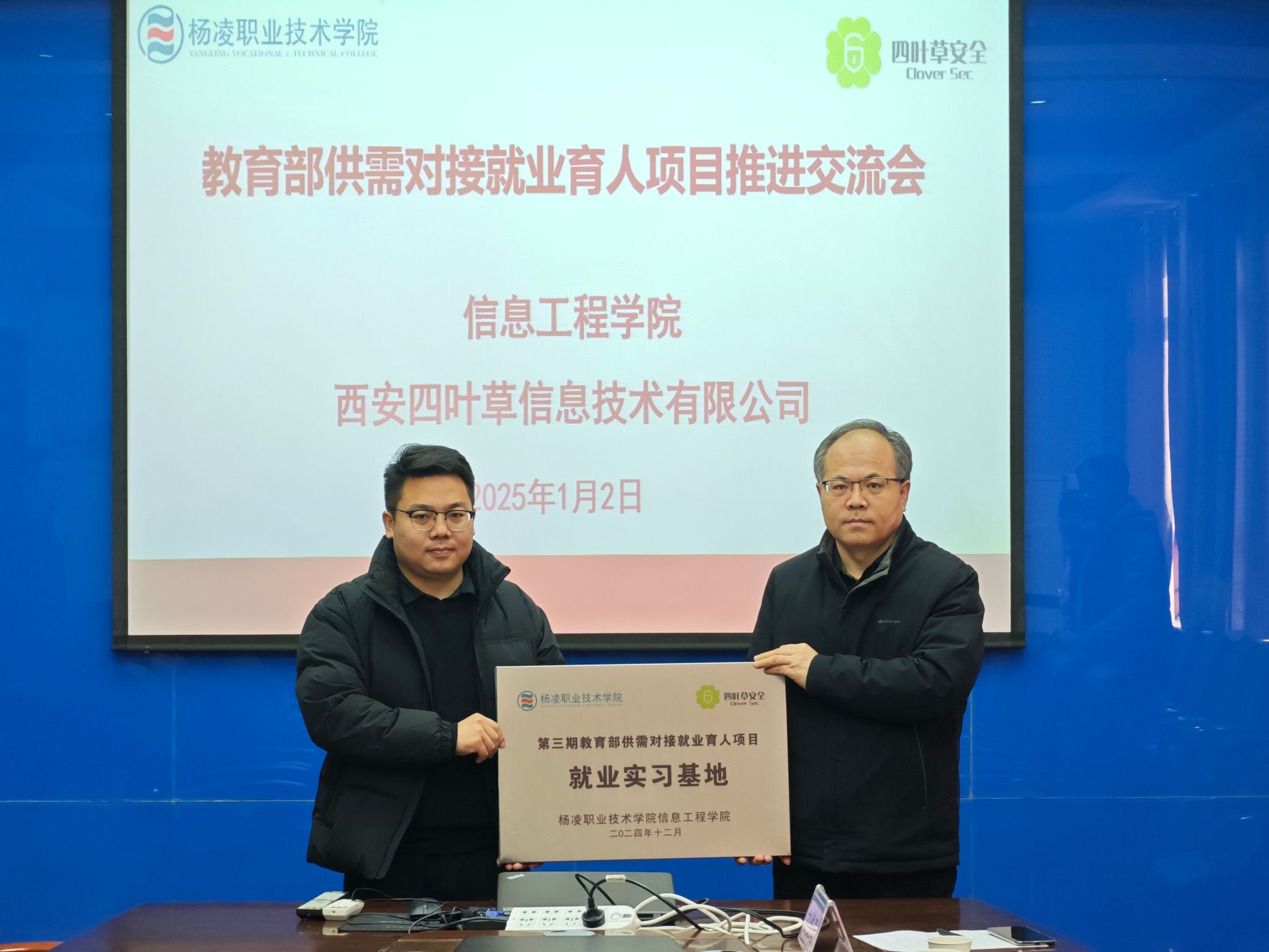 1月2日上午,信息工程学院与西安四叶草信息技术有限公司的“教育部供需对接就业育人项目”推进交流会暨授牌仪式在秦风楼四楼会议室成功举行。院长陈高锋、党总支副书记吴高潮、副院长熊刚、学工办主任任争峰、网络教研室主任冯春卫及教师代表,西安四叶草信息技术有限公司安全教育事业部总监刘伟等参加了授牌仪式及座谈会。本次项目推进交流暨授牌仪式由陈高锋主持。