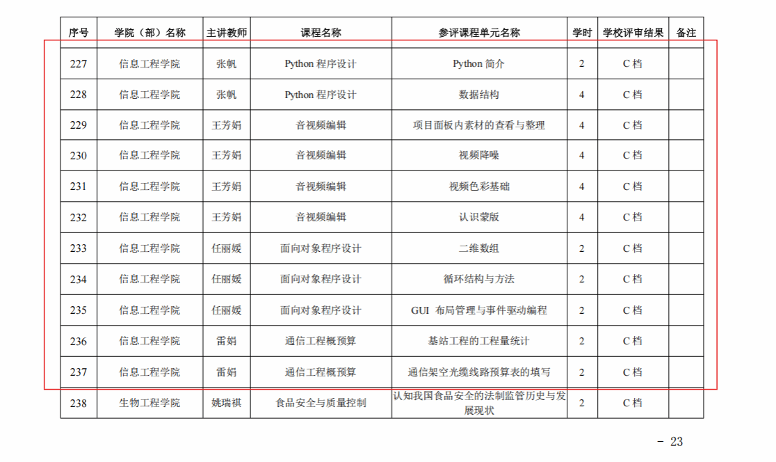 12月15日,陕西农林职业技术大学2025年下半年校级“单元金课” 评审结果公布,信息工程学院教师黄婉林主讲的《图像处理》、康金主讲的《动画素描》课程获得校级“金课”认定。本次共有65个“单元金课”评审通过,其中A档16个,B档22个,C档27个。
