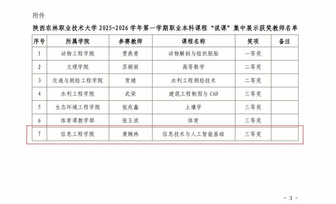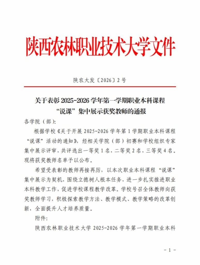 近日,学校发布《关于表彰2025-2026学年第1学期职业本科课程“说课”集中展示获奖教师的通报》(陕农大〔2026〕2号)。我院教师黄婉林荣获三等奖。