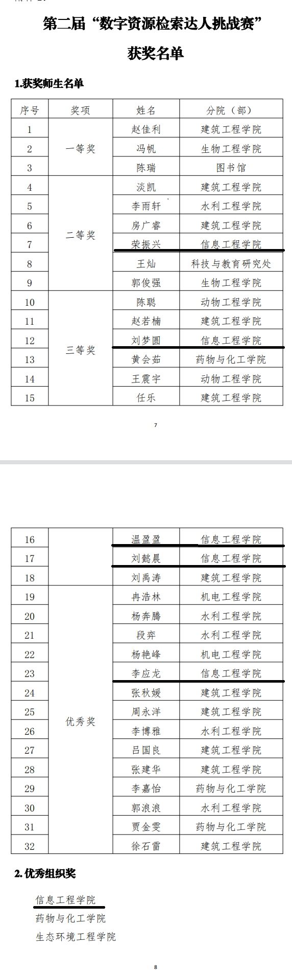 在第二届“数字资源检索达人挑战赛”中,我院荣振兴获得二等奖,刘梦圆、温盈盈、刘懿晨获得三等奖,李应龙获得优秀奖,信息工程学院荣获优秀组织奖。