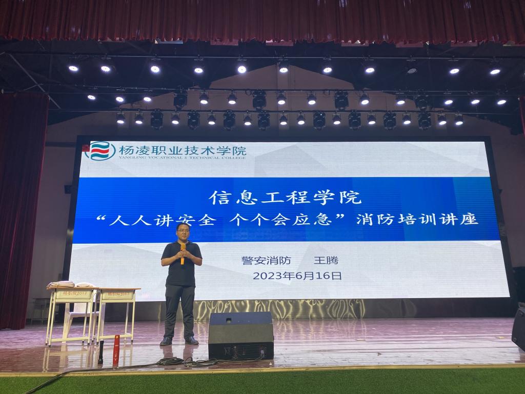 信息工程学院于6月16日下午16:30在一卡通中心举行“人人讲安全 个个会应急”消防安全专题讲座。本次讲座包括消防安全知识与消防器材讲解两部分,陕西警安消防科技集团有限公司王腾教官担任主讲人,我院全体教职工及学生代表全程参与。