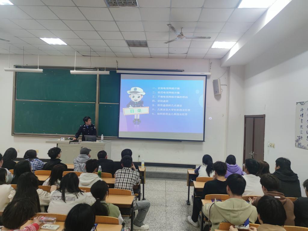王警官首先详细讲解《中华人民共和国反电信网络诈骗法》相关条例,并结合生动真实的身边案例,生动而全面地宣传网络欺凌、网络诈骗、网络犯罪、沉迷网络等方面知识,以通俗易懂的方式帮助学生们更好地理解网络保护法。随后又结合《中华人民共和国治安管理处罚法》,讲解几类涉及大学生的违法犯罪案例,如:侵犯他人隐私、殴打他人、寻衅滋事、盗窃、发送信息干扰他人正常生活、传播淫秽色情信息等违法犯罪行为,帮助同学们学会正确防范各类违法行为,鼓励同学们遇到网络伤害和其他违法伤害时及时用法律武器保护自己。
