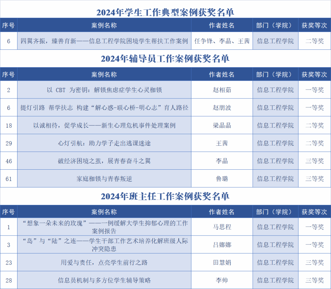 在学生工作典型案例评选中,学院选送的《四翼齐振,臻善育新——信息工程学院困境学生帮扶工作案例》获得二等奖,该案例紧密围绕学生成长成才需求,聚焦思想政治教育和困境学生帮扶,以详实的数据、生动的案例和显著的成效展现了学院在学生工作中的积极探索与实践。