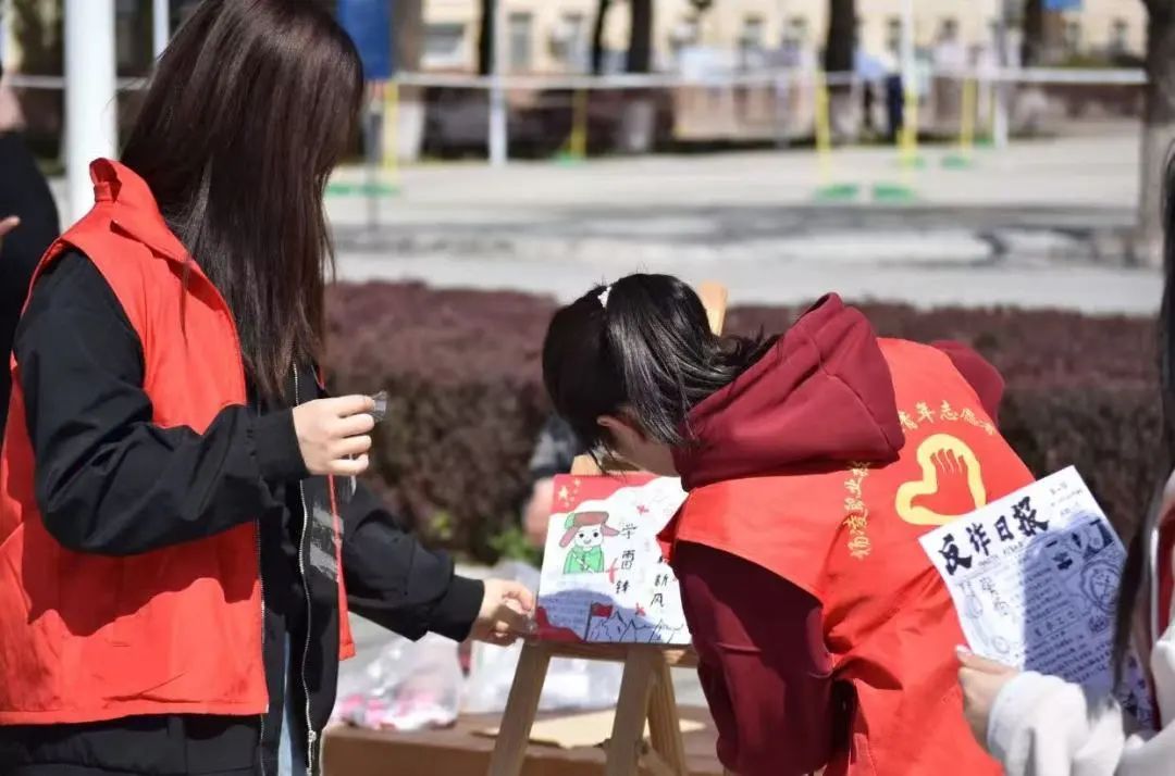 30余名志愿者有序完成场地布置工作,将广场装点成艺术长廊。展览现场,一幅幅生动的画作吸引了众多师生驻足观看。通过这些作品,大家深刻感受到了雷锋精神的伟大力量。在问答小游戏环节,大家积极抢答,展现出对雷锋事迹的熟悉和对传承精神的热忱。