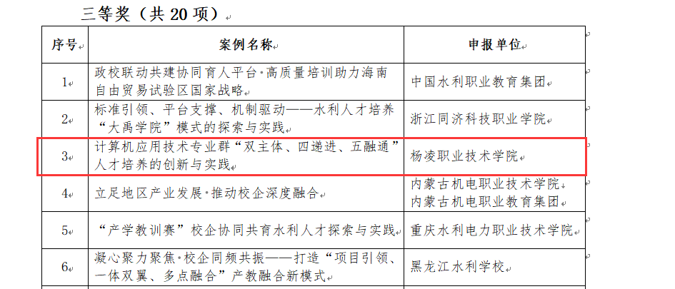 近日,中国水利教育协会公布水利职业教育“产教融合”典型案例遴选结果,我院《计算机应用技术专业群“双主体、四递进、五融通”人才培养的创新与实践》案例荣获三等奖。