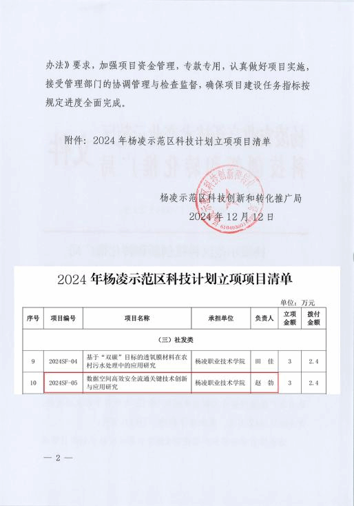 12月12日,杨凌示范区科技创新和转化推广局关于下达《2024年杨凌示范区科技计划》的通知,我院赵勃副教授主持的《数据空间高效安全流通关键技术创新与应用研究》项目获批立项。