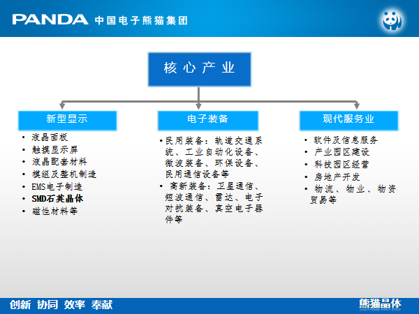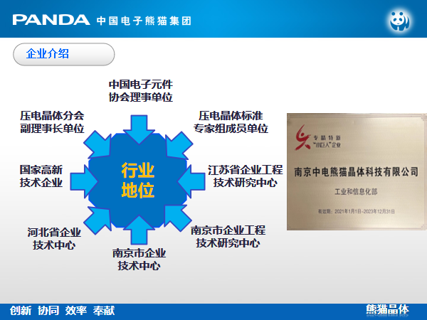 南京中电熊猫晶体科技有限公司为国家高新技术企业、国家级专精特新“小巨人”企业、国家“科改示范企业”。全国电子元件协会先进单位、全国压电晶体行业分会副理事长单位、江苏省企业技术中心、江苏省石英晶体元器件工程技术研究中心、南京市企业技术中心、南京市石英晶体元器件工程技术研究中心、南京市突出贡献企业、南京市百强成长型企业、南京市高成长科技创新型百优企业。2018年至2021年获得授权专利30项,其中发明专利5项;在申请专利18项,其中发明专利12项;软件著作权8项;参与起草的2项国家标准已颁布实施。