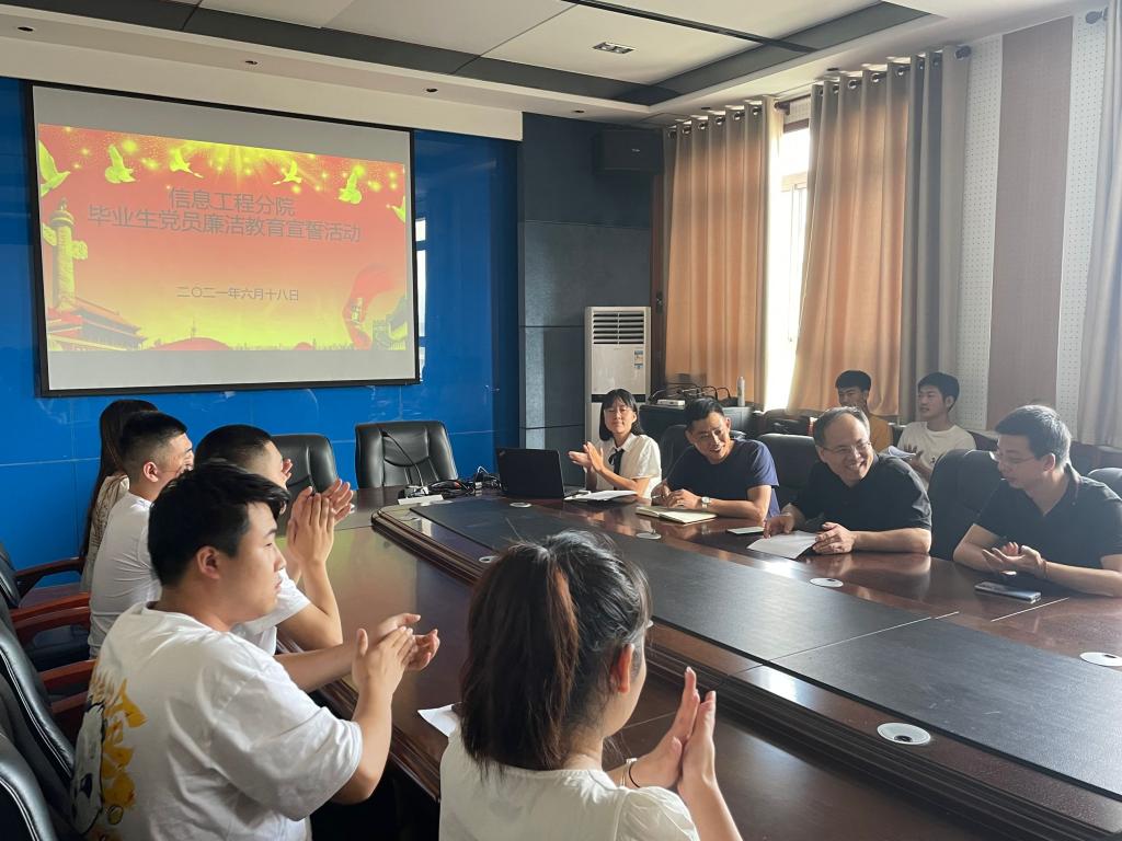 廉洁教育是毕业生即将步入社会、走上工作岗位前的重要一课。按照学院统一部署,6月18日下午15时,在秦风楼四楼会议室,信息学院党总支副书记吴高潮、学生工作办公室主任任争锋、辅导员梁晶晶、崔建鹏及2021届61名优秀毕业生举行了“清风启程、廉洁从业、砥砺奋斗”为主题的毕业生廉洁教育宣誓活动。吴高潮主持会议。