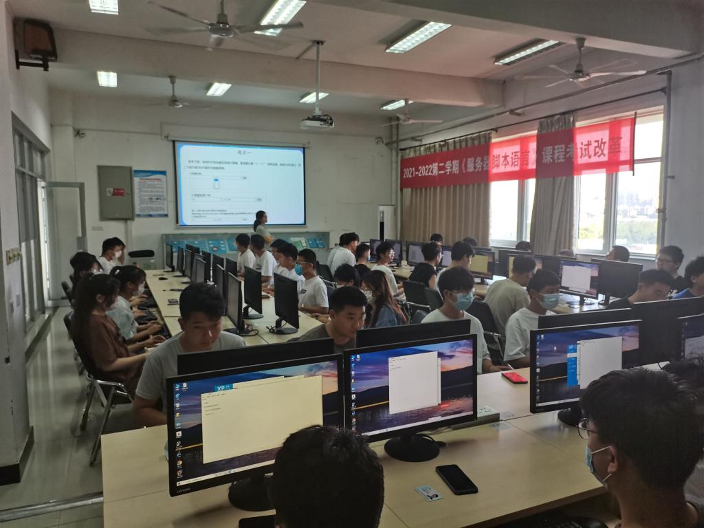 为了贯彻落实国家《深化新时代教育评价改革总体方案》,2022年7月3日,《服务器脚本语言》课程改革考试在醒钟楼NOD604和NOD609实验室圆满完成。计算机应用技术专业2020级8个班级共计330余名同学分4个批次参加考试。