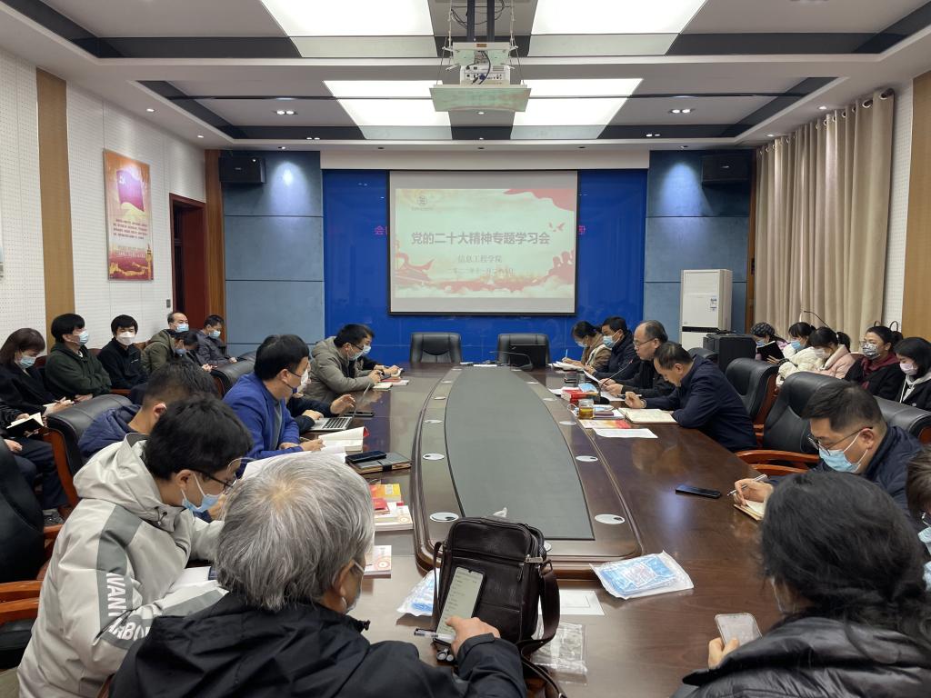 按照学院党总支政治理论学习计划安排,11月28日下午3点,信息工程学院组织全体教职工在秦风楼4楼会议室召开党的二十大精神专题学习会,要求大家认真学习,并做好学习笔记。